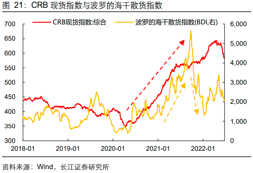 回顾2021年以来的输入性通胀,海外货币宽松、疫后复苏和俄乌冲突的爆发是导致全球大宗商品涨价的主要原因。我们以波罗的海干散货运价(石油以外大宗品的船运价格)作为度量大宗品真实需求的指标,以CRB综合指数(不含能源的大宗品现货价格指数)作为大宗品价格的度量指标,可以发现,2021年通胀有量价齐升的特点,海外货币宽松支撑了大宗商品的溢价,造成了逐步脱离大宗商品供需规律的价格上涨。而俄乌冲突的爆发又再度加剧了这一趋势,美欧等国对俄禁运制裁导致大宗品供给持续紧缺,导致价格进一步走高。
