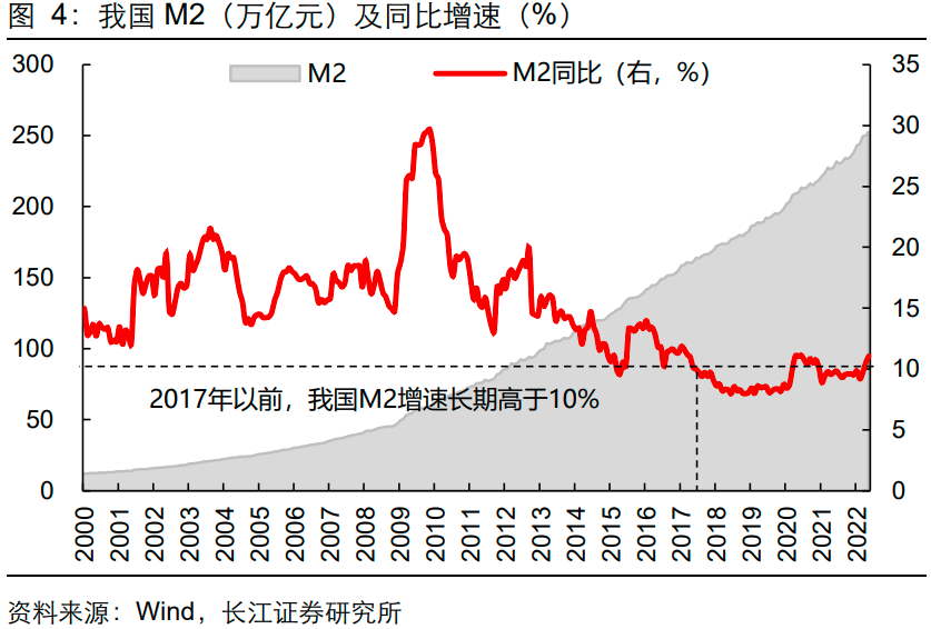 那么,是什么因素使得本轮我国通胀能够维持在较低水平?我们认为原因有二,一是本轮我国并未和之前一样超发货币,二是猪价大幅回落削弱了我国通胀上行斜率。具体来看:2017年以前,我国货币持续超发。过去二十年,我国货币规模快速增长,广义货币总量从2000年1月的12万亿扩张到2022年5月253万亿的水平,膨胀了21倍,年平均增速更是高达14.1%。M2占GDP的比重也从2000年的130%抬升至2021年的200%,意味着我国货币发行量明显多于经济增长所需,大量流动性进入实体经济,推升了通胀。![]()