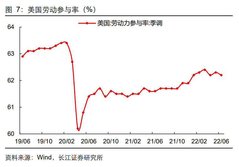 劳动参与意愿回落。6月劳动参与率再度回落至62.2%,距离疫情前63.4%的水平仍有距离,反映美国居民重返劳动力市场的意愿仍然不强。分年龄来看,作为就业市场主力的25-34岁及35-44岁劳动者参与率回落是主要拖累,其中,25-34岁女性劳动者参与率大幅回落,由上月的78.4%回落1.1pct至77.3%,而35-44岁男性劳动者参与率也回落0.7pct至89.1%,距离疫情前仍有较大差距。就业支持加息。总的来说,尽管居民重返劳动力市场的意愿偏弱,但超预期的非农数据也意味着就业市场仍在增长,美联储仍然“可以加息”,而另一边,通胀的持续走高也指向美联储“应该加息”,因此7月连续加息75BP的概率仍高。数据公布后,市场解读也同样偏鹰,10年期美债收益率跳涨至3.1%附近,美股集体低开。展望未来,我们认为,三季度在就业市场持续偏紧的背景下美联储或将持续大幅加息,但随着加息带动利率抬升,需求或将逐步降温,美国经济走向衰退的可能性不断抬升。因此,四季度美联储加息节奏或有望放缓,美债收益率或将迎来见顶回落。