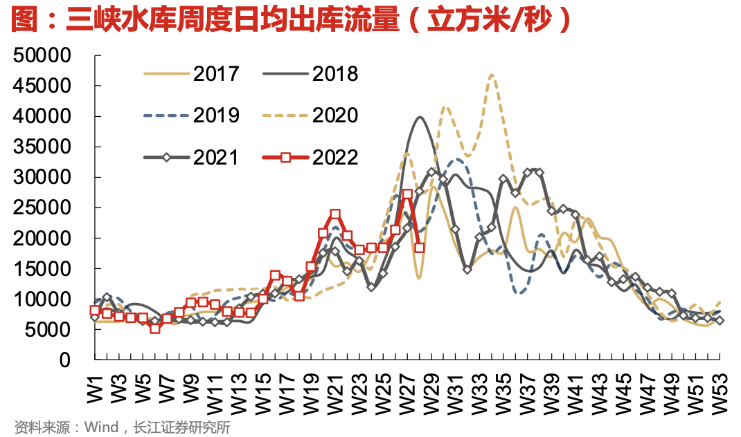 电力: 高温高压抑制水电发力, 疫情扰动拖累耗煤增速。水电方面,伊朗高压与西太平洋副热带高压打通,导致长江上游干旱高温,制约上游来水,上周三峡出库量同比增速由正转负至-33.5%,环比降幅同步扩大至32.6%。火电方面,尽管沿海遭遇高温天气,但用电需求并未明显回升,上周沿海8省电厂耗煤同比增速由正转负至-4.6%,或缘于广东、江苏等地散发疫情制约社会面用电需求。