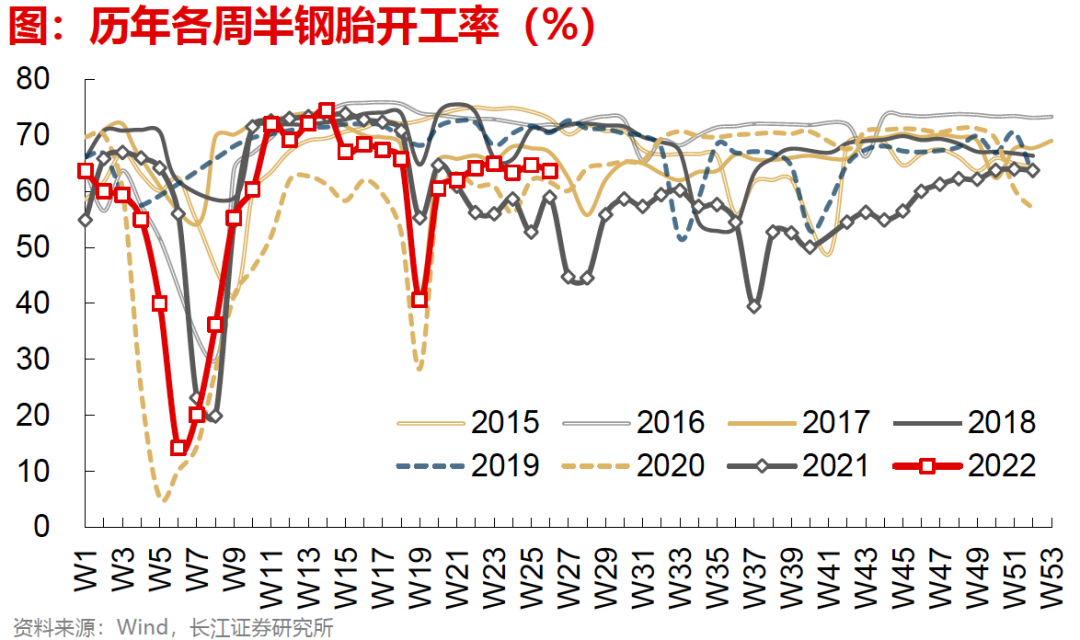 乘用车:7月上旬批零销量保持增长,开工率小幅震荡。进入7月,虽然乘用车批发、零售销量增速分别高位回落至16%、16%,但二者仍延续正增长。这反映出需求脉冲兑现后,政策利好仍在持续释放。而从库存来看,6月销量快速去化带动渠道库存系数降至1.36,位于历年同期低位,反映经销商补库的动力较强。从半钢胎开工率表现来看,汽车产业链生产强度持续保持在历年同期平均水平。