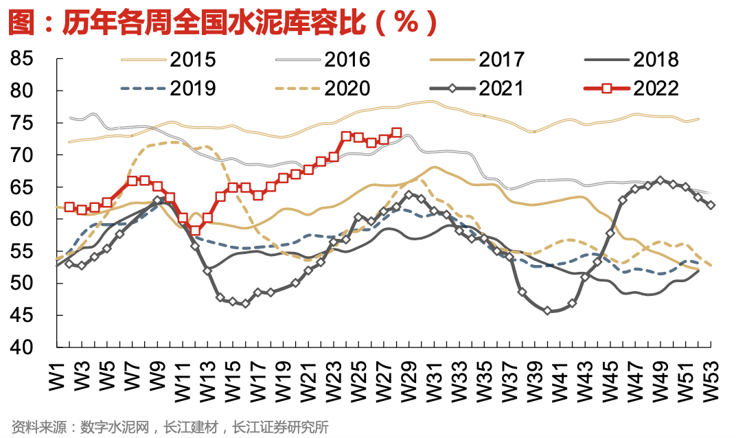 水泥:高温天气制约需求, 减产降价未能促进库存去化。上周雨带北移,使得区域水泥产销格局有所变化。西南地区摆脱雨水天气后,区域出货率有所回升。但高热天气制约多数地区建筑施工,上周全国整体出货率回落至62.5%。尽管企业采取了减产、促销等多种举措,但在需求表现更弱的背景下,上周水泥库容比高位续升至73.5%。
