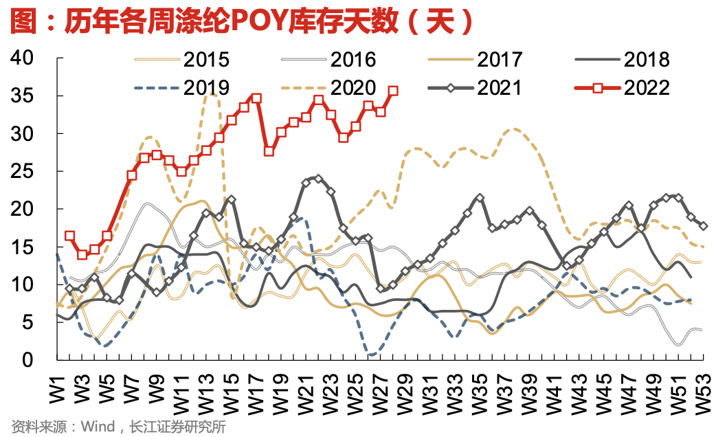 化工:油价转弱驱动价格下跌,下游库存持续累积。原油价格持续走弱,带动化工纺服链产品价格全线下跌。对于行业上游而言,油价下跌推动开工转好,上周PTA工厂负荷率回升;但对于行业下游而言,前期库存货值暴跌加重企业经营压力。由于纺服订单需求仍维持淡季水平,下游江浙织机负荷率续降,伴随涤纶POY库存天数高位续升,纺服链景气难言好转。