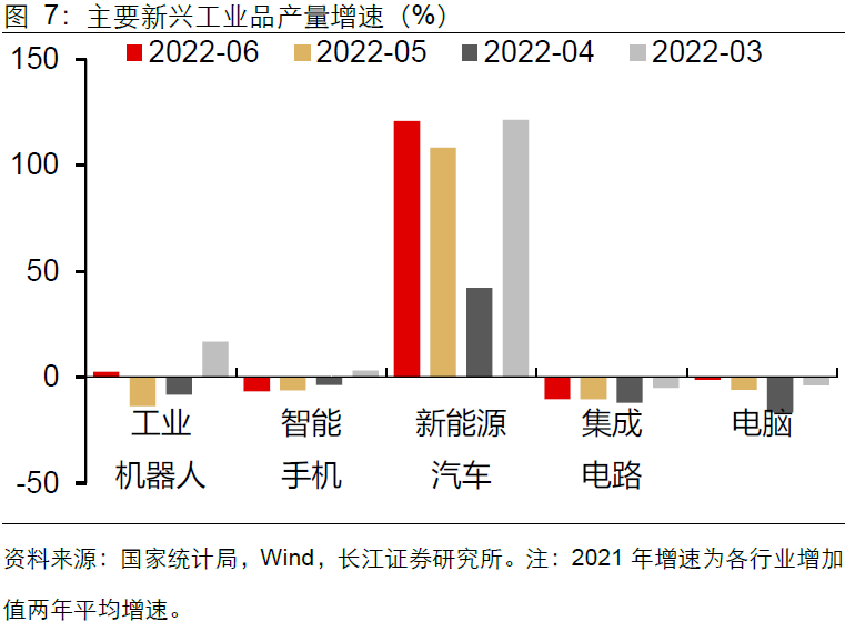 l 服务增速转正,装备制造生产亮眼。6月工业增加值同比增速继续回升至3.9%,服务业生产指数回升转正至1.3%,受生产端工业、服务业双双回升带动,用电量增速也同步回升至4.7%。就制造业内部来看,高技术制造业和装备制造业回升幅度更大。从微观产品产量来看,传统工业品产量增速涨跌互现,汽车尤其是新能源车产量一枝独秀。