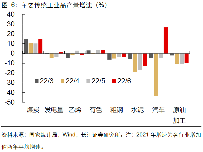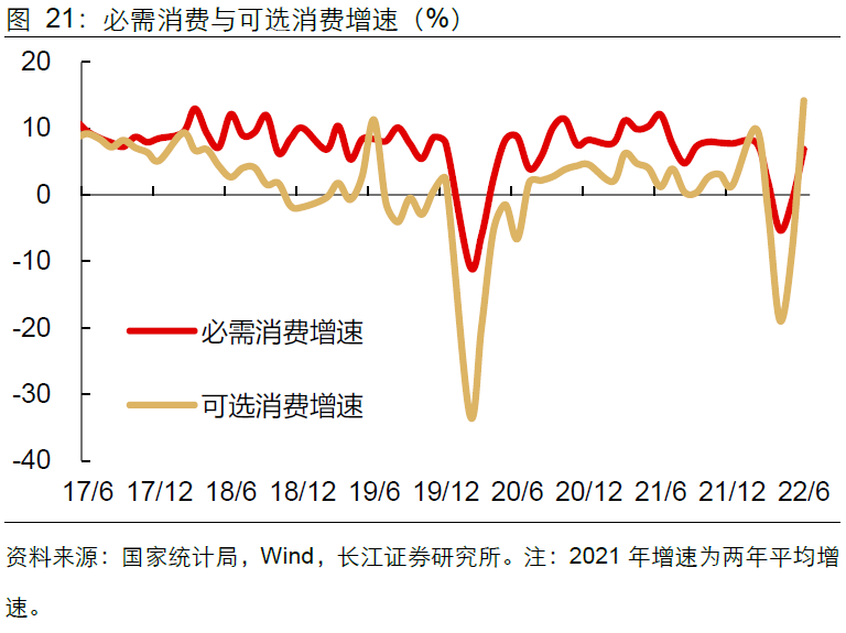 l 线下消费转正,出行主导可选转好。6月社消零售、限额以上零售同比增速分别由负转正至3.1%、8.1%。尤其值得注意的是,线下消费复苏强于线上:一方面,餐饮收入同比降幅收窄17.1pct至4%,反映防疫政策更趋精准后释放了更多线下消费的潜力;另一方面,虽然实物网上零售同比增速回落至5.6%,但社零中商品零售的总增速却由负转正至3.9%,估算剔除网上零售后的社零增速已回升转正至2.6%,反映线下消费的活跃度有明显改善。而分品类来看,必需、可选消费同步转好。其中,石油及制品、汽车类消费增速回升最为明显,反映了乘用车购置税减免、原油涨价、居民出行恢复的多重影响。
