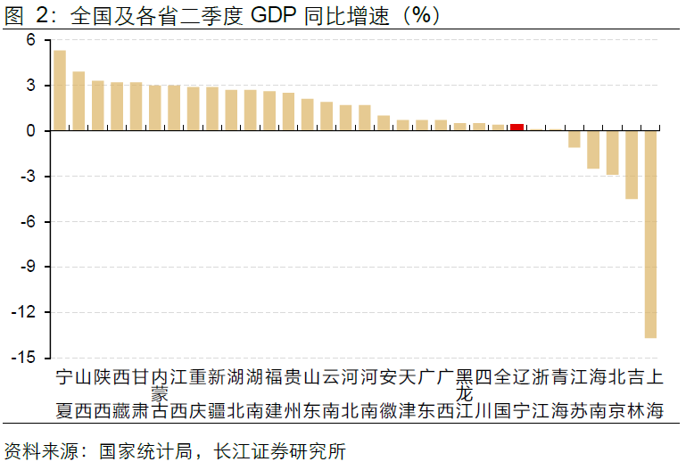 横向对比来看,地区经济增长走势分化。一方面,长三角地区除安徽外表现均不理想,二季度上海、江苏、浙江GDP同比增速分别录得-13.7%、-1.1%、0.1%。另一方面,北京GDP同比增速则较上季度大幅下降7.7pct至-2.9%。