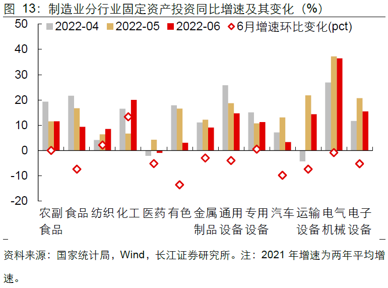 制造业投资持续发力,但增速抬升速度放缓。而受出口保持韧性、基建持续发力带动,制造业投资温和回升,估算6月制造业投资增速回升至9.9%。但值得注意的是,6月制造业投资回升,主要归功于化工、纺织、专用设备等少数行业较5月边际改善,反映企业整体投资意愿或在边际走弱。