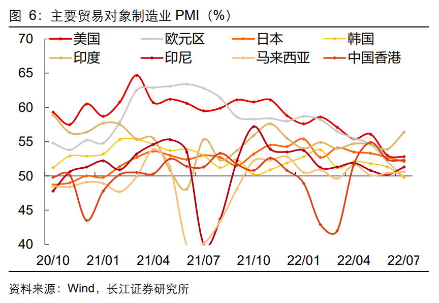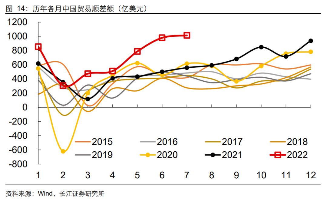 出口增速保持韧性。7月我国出口依然高增,同比增速18%,较上月基本持平。5月以来,出口已连续3个月高于15%,呈现出较强的韧性。分类型看,一般贸易出口同比增速高位续升,加工贸易同比增速小幅回落,分别录得25.3%、7.4%。分品类看,我国机电产品和劳动密集型产品出口金额同比纷纷大幅回升,高新技术产品出口金额同比增速大幅回落至2.4%。分出口地区看,我国对发达国家出口增速仍处高位,对欧盟、日本出口增速大幅抬升,分别录得23.2%、19%,而对美出口增速回落至11%,这也印证了美国需求在高利率高通胀环境下已经出现走弱迹象。我国对印度、东盟、韩国等亚洲周边贸易伙伴的出口增速仍处高位。总的来说,7月出口在基数抬升的背景下仍然维持了强劲回升,对经济形成较好支撑,我国出口竞争力仍强。一则,外需仍在衰退早期,下滑趋势并不显著,而从海外需求转弱到国内出口回落也有一定时滞。一方面,从外需景气度来看,尽管7月美欧日韩等国制造业PMI均持续回落,部分地区PMI跌破荣枯线,意味着未来经济有较大下行压力,但当前仍处于经济由强转弱的阶段性拐点中,外需走弱速度相对较缓,对我国出口形成支撑;另一方面,以韩国7月前10日出口增速作为参考,数据较上月出现小幅反弹,同样指向外需并未实质性走弱。二则,原材料涨价推升出口额。受国际大宗商品涨价带动,出口主要代表性商品中,我国稀土、成品油、肥料等上游原材料出口金额同比维持高位,且增长主要由价格因素贡献,数量贡献均为负。三则,汽车、服装等下游消费品需求大幅增长。随着我国汽车生产修复以及海外疫情防控放松后出行需求激增,本月汽车出口金额同比增长64%,与此同时,箱包、鞋靴等下游消费品出口也迅速增长,均呈现出数量因素贡献远高于价格因素的特征,是我国出口走强的主要支撑。进口增速小幅抬升。7月我国进口金额同比增速回升至2.3%,其中,国际粮价上行再度带动我国进口农产品金额增速大幅攀升至8.7%,进口高新技术产品、机电产品金额同比降幅收窄。我国内需走弱带动大宗商品需求回落,进口大豆、原油量减价增,但与此同时,国际铁矿石价格大幅回落,我国适时加大了铁矿石进口数量,对我国进口形成支撑。出口仍有下行压力。在强劲出口的带动下,7月贸易顺差较上月走扩至1012.7亿美元,大幅高于过去五年同期。第一,近期我国本土疫情再现多地反弹趋势,短期生产、物流运输等问题或受到一定程度的影响;第二,去年同期基数较高使我国出口增速面临持续的下行压力;第三,海外多国受货币政策收紧以及高通胀的影响需求逐渐转弱,外需难以延续。