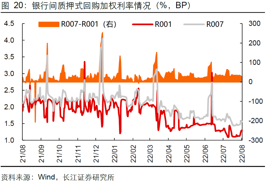 发电耗煤增速续升,钢铁铁水成材生产分化。8月15日-8月18日,沿海八省电厂发电耗煤单周均值同比增速续升至13.8%,较上周上抬7.3pct,但主要缘于高温难消。最新一周(8月19日当周)本周高炉开工率续升至77.9%,但全国电炉开工率边际走弱至53.9%。产量方面,最新一周(8月19日当周)Mysteel样本钢厂钢材总产量同比降幅缩窄至10%,其中,螺纹钢产量同比降幅缩窄至18.3%。此外,最新一周(8月19日当周)螺纹钢、热轧均价双双回落,钢材社会库存总量加速去化。肉价回落,菜、果抬升。从高频数据来看,最新一周(8月15日-8月19日)28种重点监测蔬菜、7种重点监测水果、猪肉平均批发价周均值较上周均值分别上涨3.2%、上涨0.6%、下跌0.7%。农产品和菜篮子批发价格指数周均值较上周均值分别抬升0.9%、1%。预测8月CPI环比趋降。从高频数据来看,8月以来,菜篮子产品批发价格200指数、28种重点监测蔬菜、农产品批发价格200指数较上月均值分别上涨0.3%、0.3%、0.2%,7种重点监测水果、猪肉平均批发价较上月均值分别下跌2.6%、0.2%。综合来看,我们预测8月CPI环比趋降。煤价抬升,油、钢回落。从各项高频指标变动趋势看,最新一周(8月15日-8月19日)Brent油价和WTI油价均值较上周均值分别下跌6.9%和3.1%。秦皇岛山西产Q5500动力煤平仓价、螺纹钢、热轧板卷最新一周价格均值较上周均值分别上涨1.2%、下跌0.3%、下跌0.8%。预测8月PPI环比趋降。从高频数据来看,8月以来,螺纹钢价格、热轧板钢价格较上月均值分别上涨3.5%、1.1%,Brent油价、WTI油价、秦皇岛山西产Q5500动力煤价格较上月均值分别下跌10.4%、9.1%、6.5%。综合来看,我们预测8月PPI环比趋降。短端利率上行。最新一周(8月15日-8月19日)R001和DR001均值分别环比回升10BP和回升10BP至1.22%和1.13%;R007和DR007均值分别环比回升7BP和回升5BP至1.53%和1.39%。1M、3M和6M同业存单发行利率分别报于1.53%、1.66%和1.9%,分别回升14BP、回落1BP和回落15BP。 从期限利差情况来看,银行间质押式回购利差(R007-R001)、存款类机构质押式回购利差(DR007-DR001)周度均值分别收窄3BP、收窄4BP。最新一周(8月15日-8月19日)央行公开市场净回笼2000亿元。其中,开展100亿元逆回购操作,100亿元逆回购到期,逆回购层面净投放0亿元;此外,MLF投放4000亿,MLF回笼6000亿。最新一周(8月15日-8月19日)人民币兑美元汇率贬值,美元指数回升,中美国债利差倒挂、环比走阔。离岸、在岸美元兑人民币汇率周均值分别回升至6.808、6.7894。美元指数周均值回升至107.05。10Y中美国债利差周度均值为-26BP,环比-18BP。最新一周(8月15日-8月19日)央行超预期降息,长端利率大幅下行。具体来看,1Y国债和国开债到期收益率分别环比下行8.7BP和下行3.2BP至1.72%和1.82%;10Y国债和国开债到期收益率分别环比下行14.7BP和下行11.7BP至2.59%和2.79%;10年期国债期货合约价格由101.26元上涨至101.59元,周涨幅0.33%。