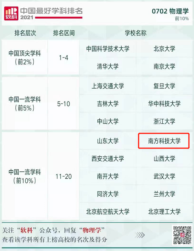 ▲物理学,南科大2021排名12