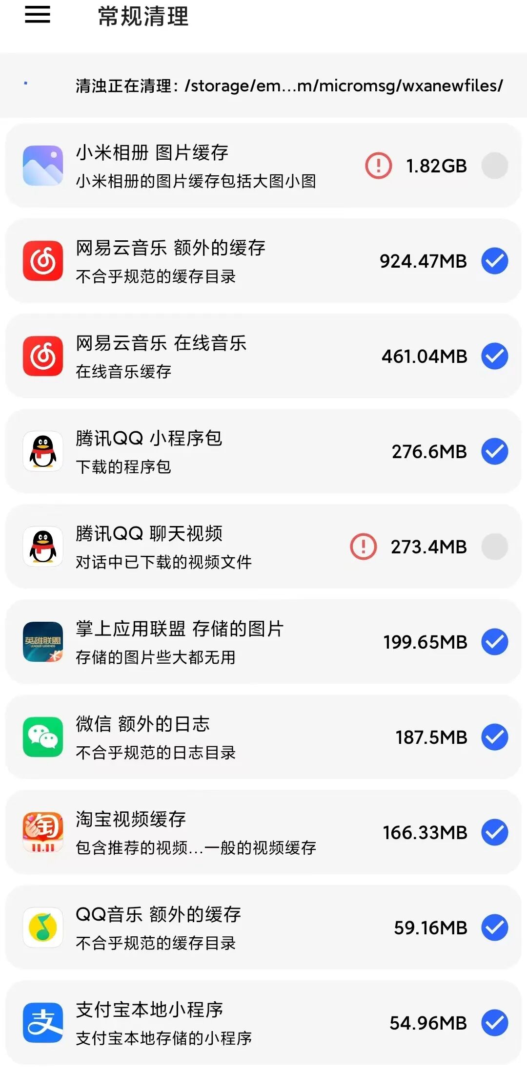 一般来讲自动勾选的都可以放心直接清理,没有自动勾选的清理项都会有感叹号,让你斟酌过后再看是否需要清理,这点非常贴心。