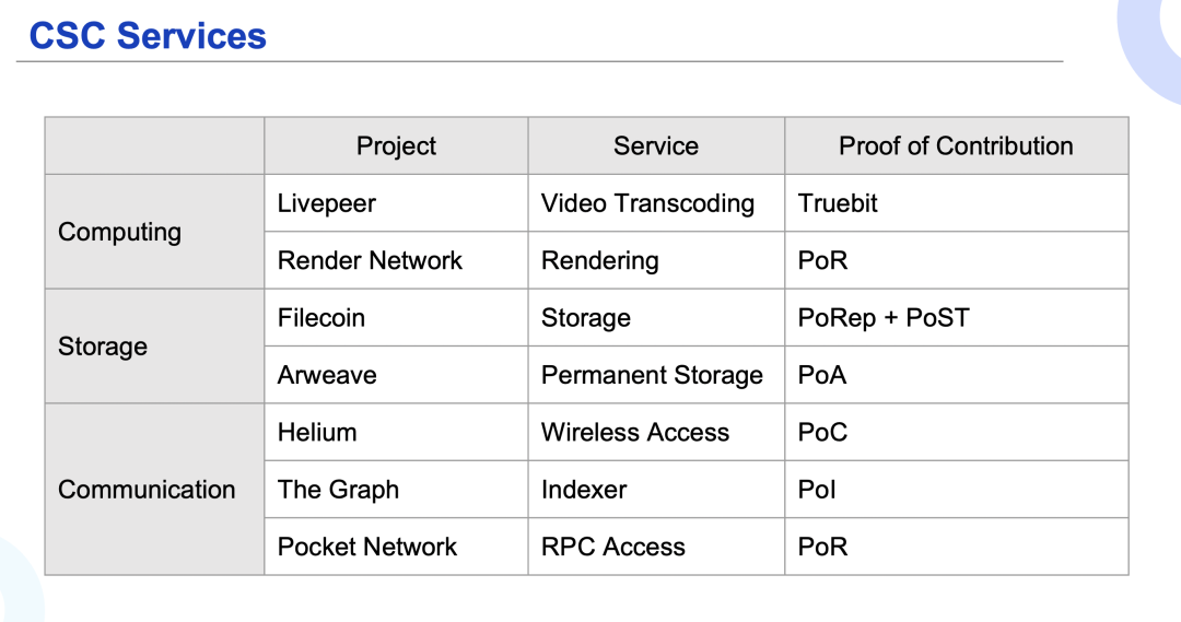 CSC Services 提供的是一些同质化的服务。这些服务是线上的,但不是链上的。因为是同质化的线上服务,Web3创业者找到了相应的方法证明参与者的贡献,从而能够用去中心化加密协议的方式来启动网络。下面我们介绍几个典型的CSC Services项目。
