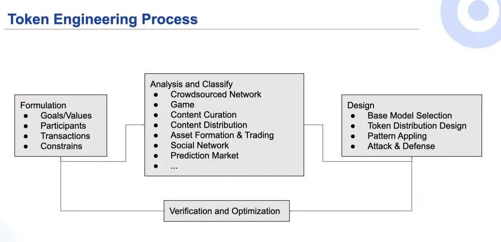 Token Engineering Process:第一步是要分析问题,你要建立什么样的平台?平台的价值是什么?它有哪些参与者?他们之间发生什么交易?平台的受的限制是什么?有了基本的分析,就可以做网络效应分析。然后你要把加密网络分类,这里面有不同的类,大概这名字能够解释。分类了之后,你就要把这个类的所有的主要的项目都找到,然后研究他们的白皮书。找这个领域的研究报告。对这个行业对这个领域足够了解,否则的话你很难说服投资人,而且也浪费了一个捷径,就是找到目前为止最好的设计。你把现有的设计都看一遍,这能省时间,因为每个项目都花了大量的时间去得到自己的模型。有这个基础之后,你就可以开始设计了。首先要选择一个基础模型,这个基础模型可以是同类项目里面你最欣赏或者你认为最合意的模型。如果没有,可以从我刚才介绍的通用基本模型开始。然后就做 Token Distribution Design,就是我们前面讲的过程。然后一些具体的问题可以去用通证设计模型来解决。解决了这些问题得到了一个基础模型之后,要去做 Attack & Defense。就是说找一些懂行的朋友来,假设各种攻击的方法,最主要的就是贡献去撸币,但并不真的给网格贡献价值。你要通过调整模型或者是增加新的约束去解决这些问题。最后就是 Verifcation。有一个初步模型之后,你可以回过头来再看你的目标是不是能够变得更大、更有价值或者是更现实,甚至有可能你要做大的重构,是不是能够引入一种新的参与者让平台更有价值,或者减少一种参与者来简化模型,或者是增加或者减少交易类型等等。这是一个迭代的过程,跟软件工程非常像。![]()