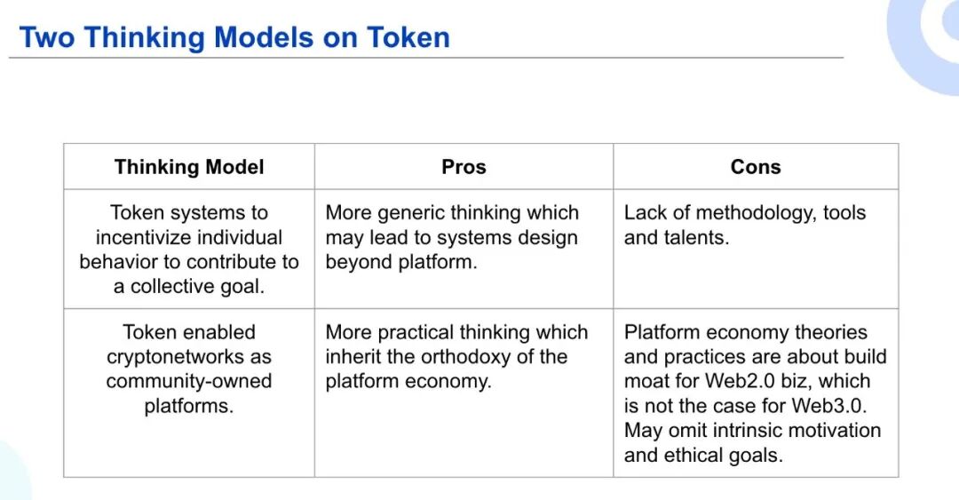 我们说 Design 和 Engineering。到底为什么我们现在管它叫通证工程?它跟 Design 是两个重叠度很高的领域,但是相对于设计来说,工程更强调的是科学性和现实性,就是说 Design 可以出于任何一种价值取向去设计出一个东西,但是 Engineering 强调你设计的东西它是一个在现实世界中能运行的结构,而这个结构要给人们创造出某种效用某种福利。你要想让自己设计的结构在现实世界中能运行,它一定本身是科学的,必须通过一个严谨的过程。而且要能够被现实世界接受,它应该是合法的,在经济上是可行的,而且在道德层面实际上是能够被你的目标用户所接受的。另外 Engineering 里面很重要的一个责任感的,就是说我们作为工程师,我们做出来的东西在社会上产生的后果,我们要承担责任。就是要以负责任的态度去做工程。 两种思考模型