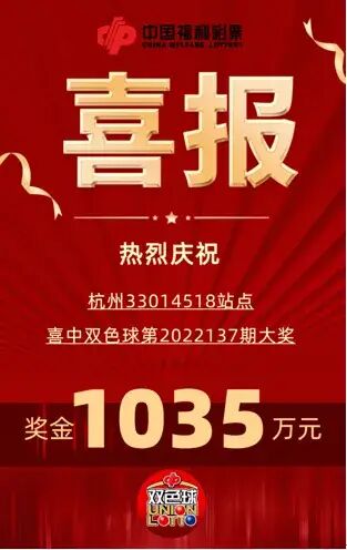11月29日,双色球第2022137期开奖,全国共中出8注一等奖,单注奖金762万元,我省杭州购彩者中得其中一注,共获奖金1035万元。
