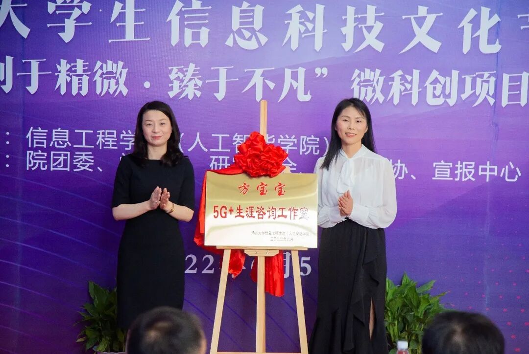▲校党委学生工作部(处)部(处)长徐蕾老师为“方宝宝”5G+生涯咨询工作室揭牌
