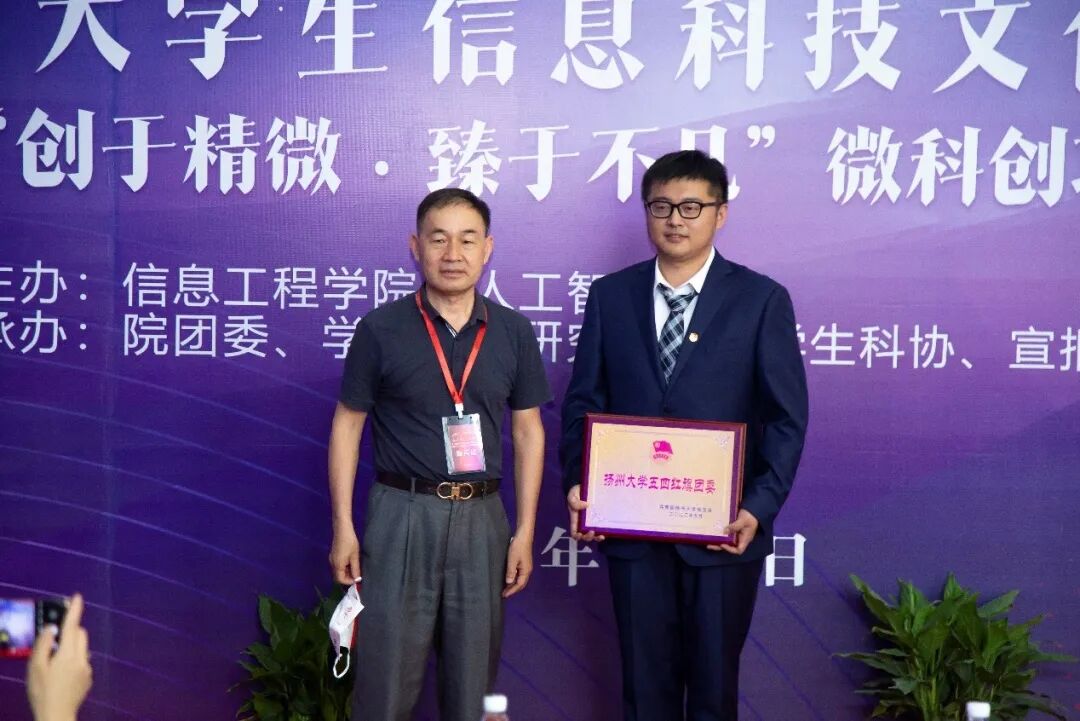 ▲校保卫部(处)部(处)长、人武部部长姚永明老师,校党委教师工作部常务副部长、人事处副处长周保垒老师为校活力团支部颁奖