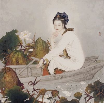 盛放的荷花丛中正有一叶扁舟摇荡。舟上是游兴未尽的少年才女,这样的美景,一下子跃然纸上,呼之欲出。