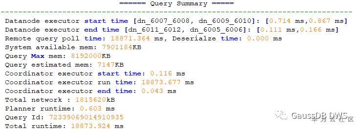 主要显示CN的最大内存用量、DN最大内存用量、各算子的最大内存用量、各算子预估内存用量、Stream线程的启动以及收发时间。