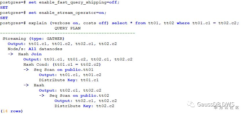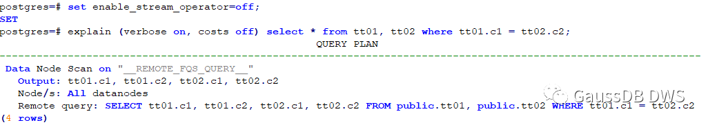 两表JOIN,且其连接条件为各表的分布列,在关闭stream算子的情况下,CN会直接将该语句发送至各DN执行,最后结果在CN汇总。