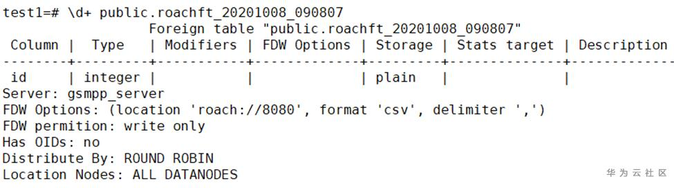 图3 Roach逻辑备份创建的外表 3) Roach工具与DN的建连及数据导出备份 当前GaussDB(DWS)的集中主要数据导入导出外表包括GDS、HDFS、OBS、Roach等四种,Roach外表同其他几种外表类似,都通过FDW(Foreign Data Wrapper)完成,但注册了一系列属于Roach的FDW API接口实现,此外,Roach还实现了Open/Read/Write/Close/ErrorReport等五个主要的底层读写API,实现DN与Roach Agent之间的数据交互。