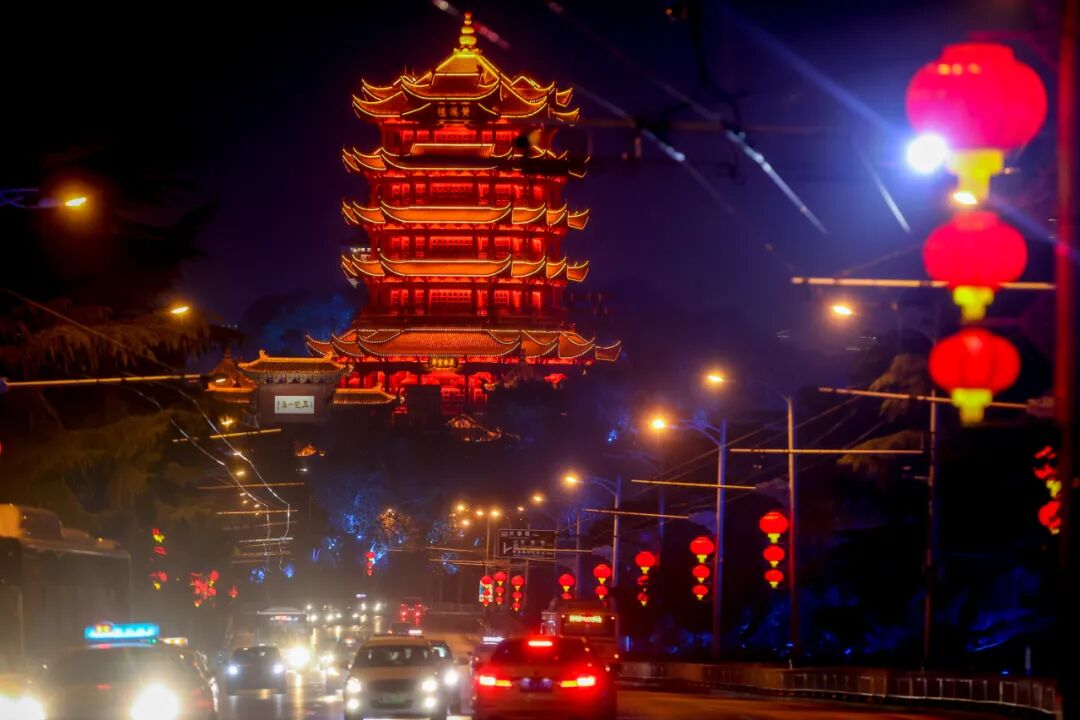 ▲今年春节,武汉长江大桥的红灯笼与黄鹤楼。张畅摄