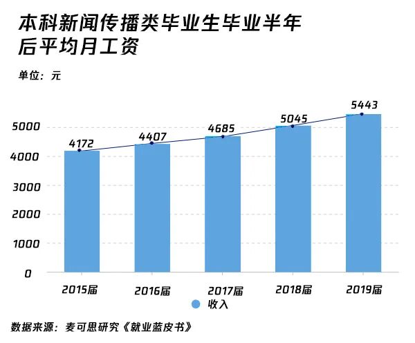 公众号“全媒派”指出,根据麦可思研究《就业蓝皮书》中公布的相关数据,对比从2015届到2019届新闻传播类本科毕业生在毕业半年后的平均月工资金额可以看出,从2015届到2019届,本科生毕业半年后月工资从4172元提升到5443元。