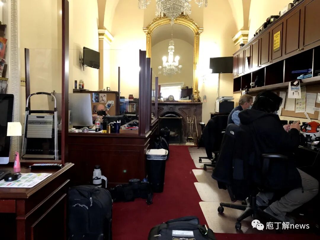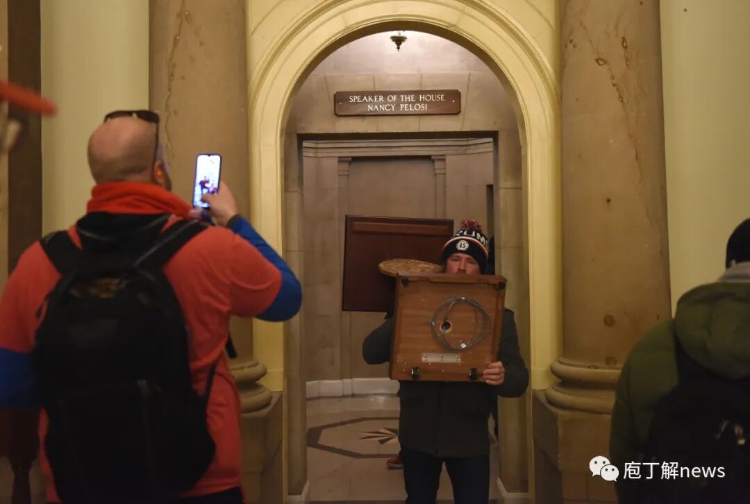 国会大厦内部警力薄弱。警方让出了中央大厅和雕像大厅等空旷区域,试图在参议院和众议院的入口阻挡示威者进一步闯入。但很快这两处美国政治的核心地带,也被突破。示威者冲入众议院议长佩洛西的办公室,我拍下了示威者搬出一个木制讲台的瞬间。
