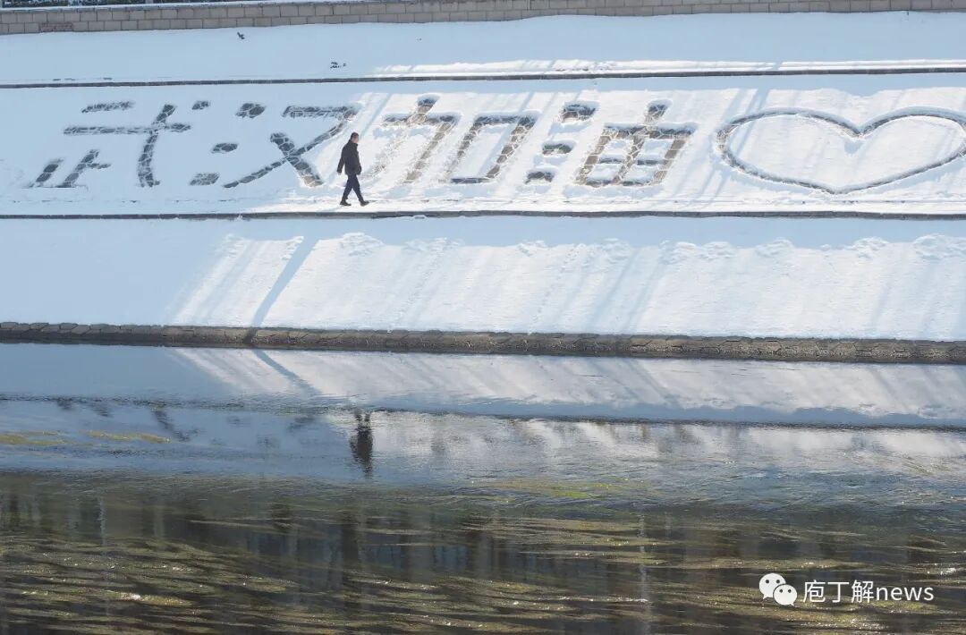 2020年2月8日,北京通惠河畔的积雪上写着“武汉加油”的文字。