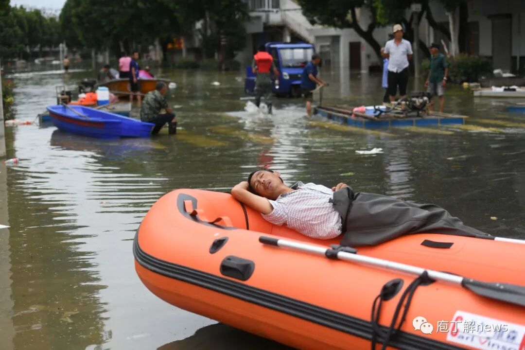 2020年7月23日,安徽巢湖柘皋镇,一位工作人员在搜救艇上休息。