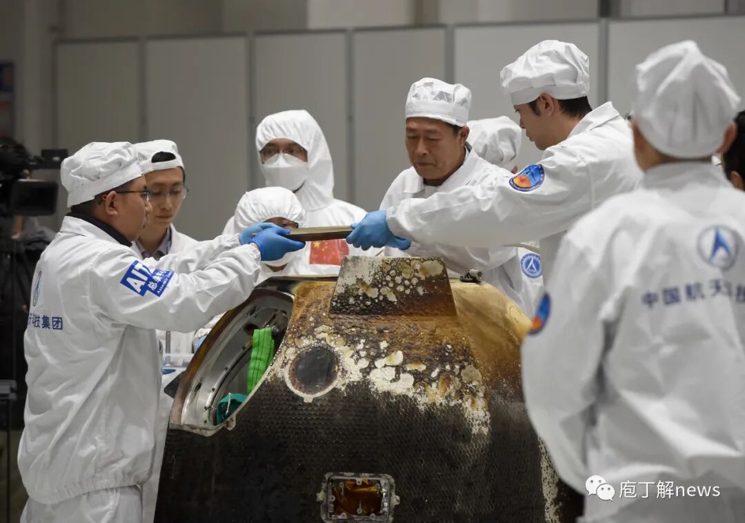 2020年12月17日晚,嫦娥五号返回器在位于北京的航天科技集团五院(中国空间技术研究院)进行了全面检查。图为17日晚拍摄的工作人员开启嫦娥五号返回器进行检查。