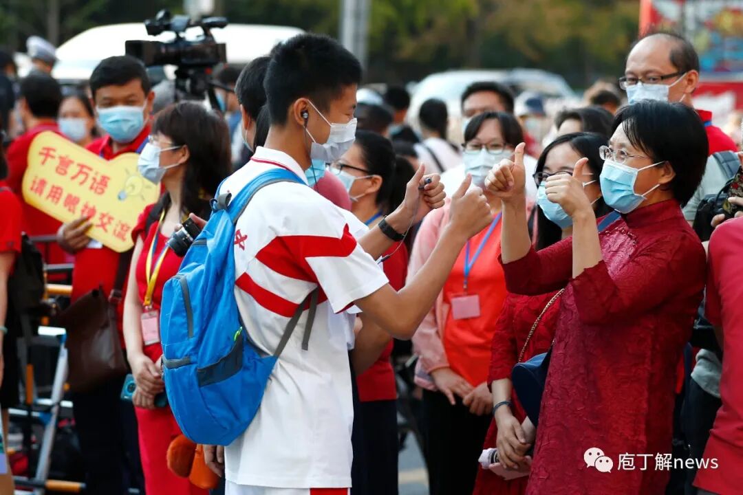 2020年7月7日,北京,中国人民大学附属中学考点,考生与送考老师相互“点赞”。