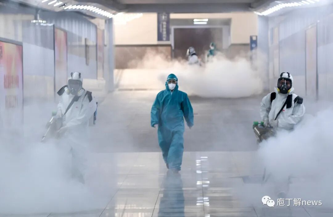 2020年2月4月,湖南长沙,蓝天救援队的志愿者手持重型消毒机器,对长沙火车站进行消毒杀菌。