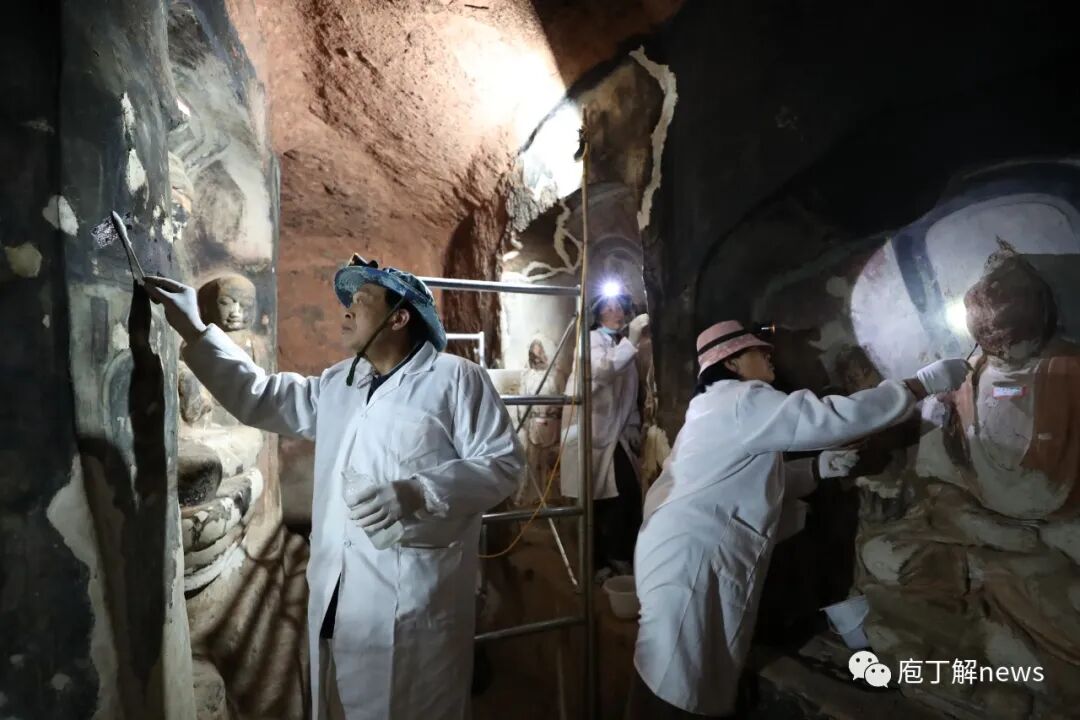 2020年4月17日,宁夏固原,工作人员正在修复须弥山石窟的壁画。