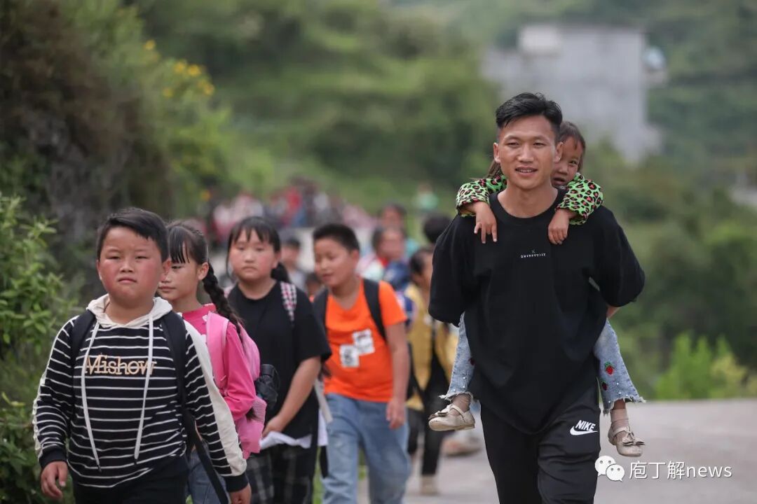 2020年6月4日,贵州省毕节市织金县“90后”乡村教师彭有兴护送学生回家。每个工作日他都会跑步到村口,沿途组织150余名学生排队上下学,每次接送里程8公里。
