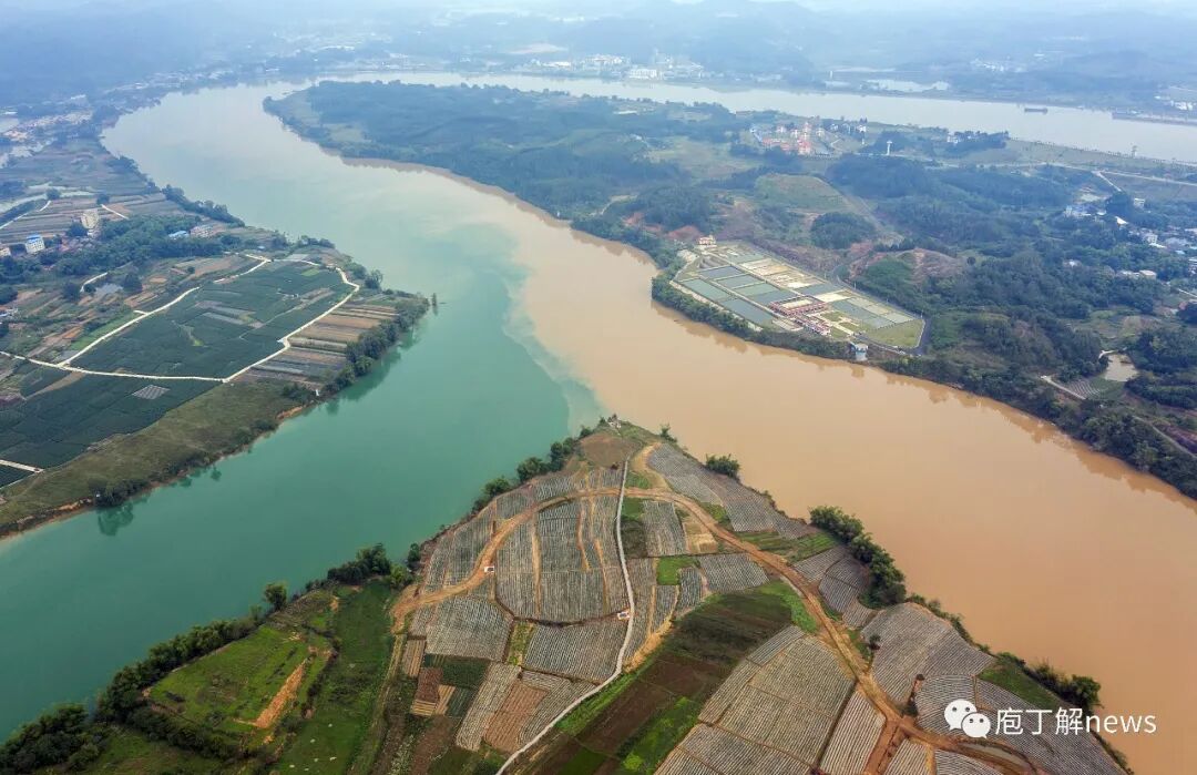 2020年7月12日,航拍位于鄱阳湖东岸的江西鄱阳县珠湖联圩,呈现一堤之隔泾渭分明的景观。