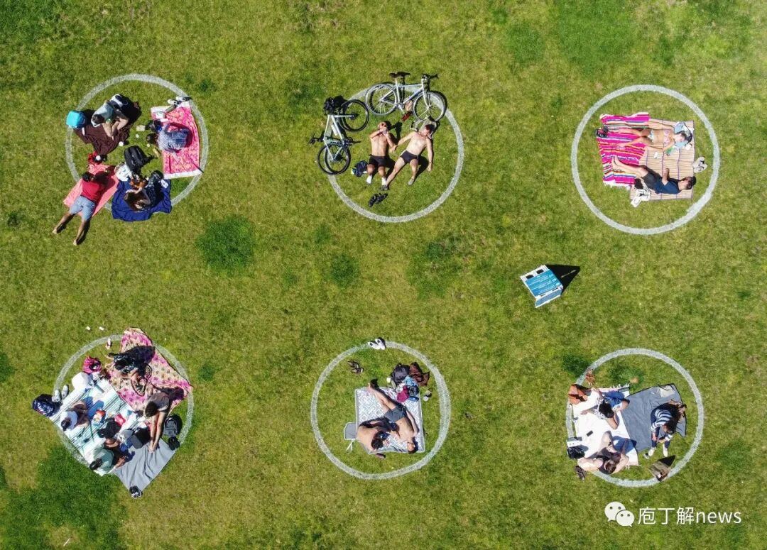 2020年5月24日,美国旧金山市区的多洛雷斯公园在草坪上画出数百个圆圈,以敦促前来休闲娱乐的人们保持“社交距离”。