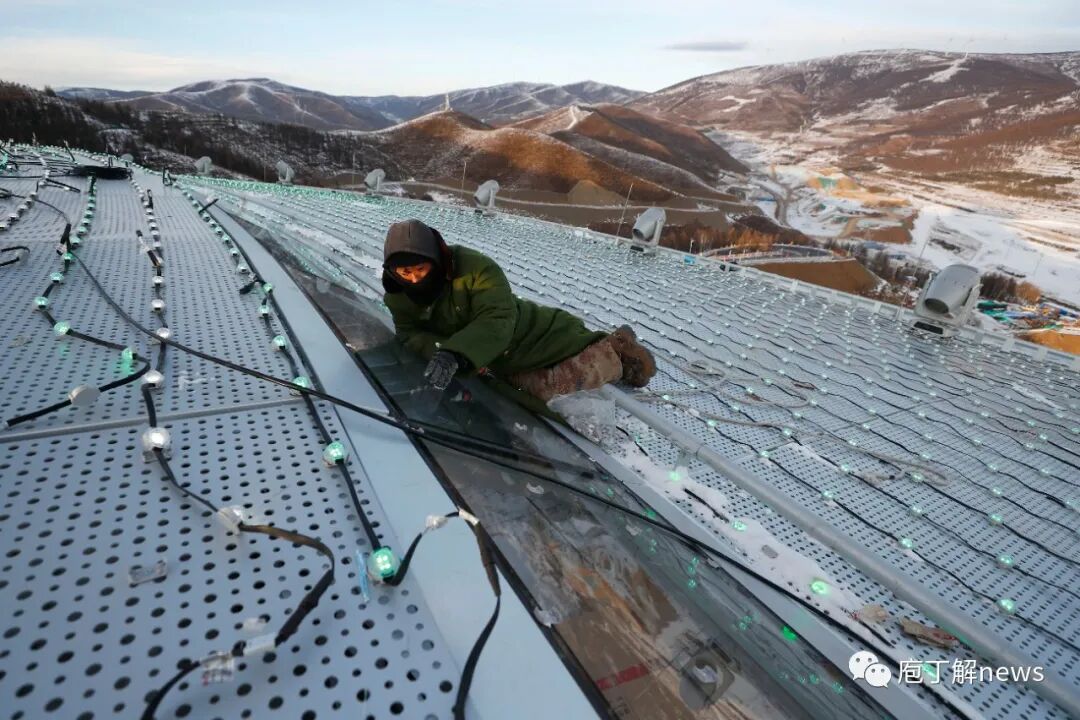 2020年12月8日,位于河北省张家口市崇礼区的国家跳台滑雪中心“雪如意”正在加紧建设,北京2022年冬奥会期间此处将承办跳台滑雪比赛。图为施工人员在顶部安装灯带。