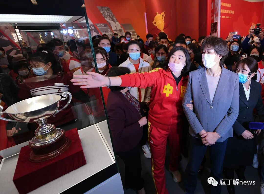 2020年10月22日,中国女排主教练郎平(右)在参观展览。当日,中国女排主教练郎平来到天津美术馆,参观《国家荣誉——中国女排精神展》。