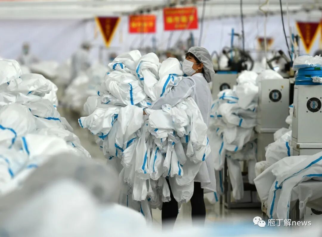 2020年2月17日,在河北石家庄生产医用防护服的“超级工厂”内,工人们正在紧张忙碌着。