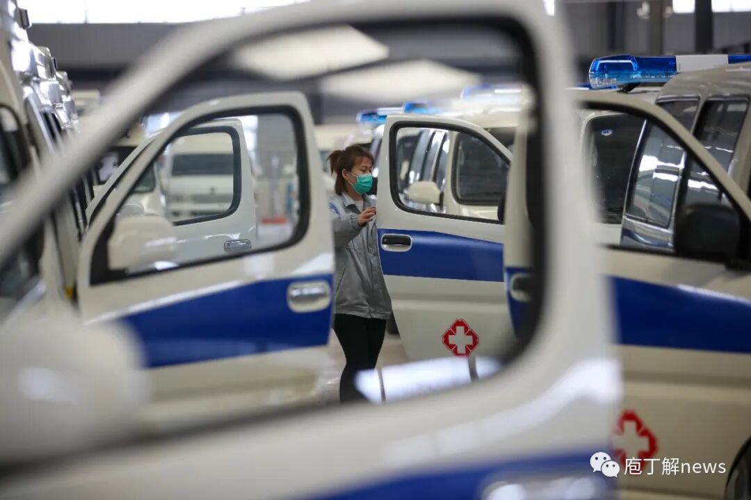 2020年3月18日,辽宁沈阳,汽车生产基地内的工作人员正在检验救护车。