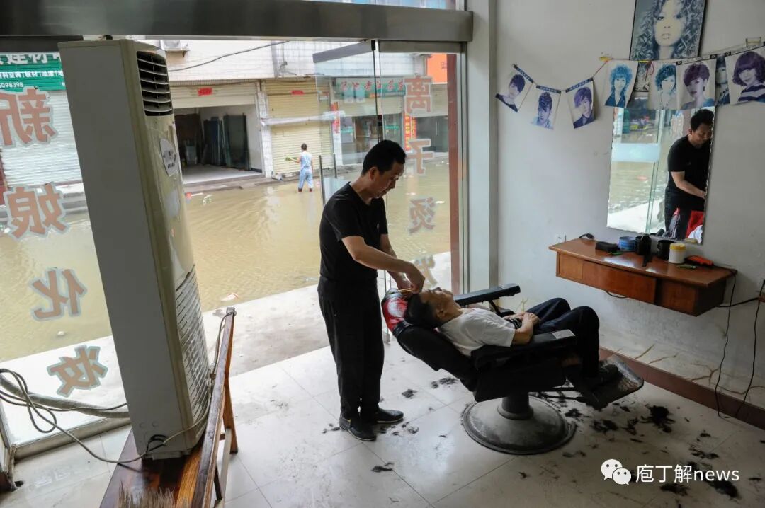 2020年7月23日,安徽庐江白山镇遭洪水入侵,一家理发店在积水中营业。