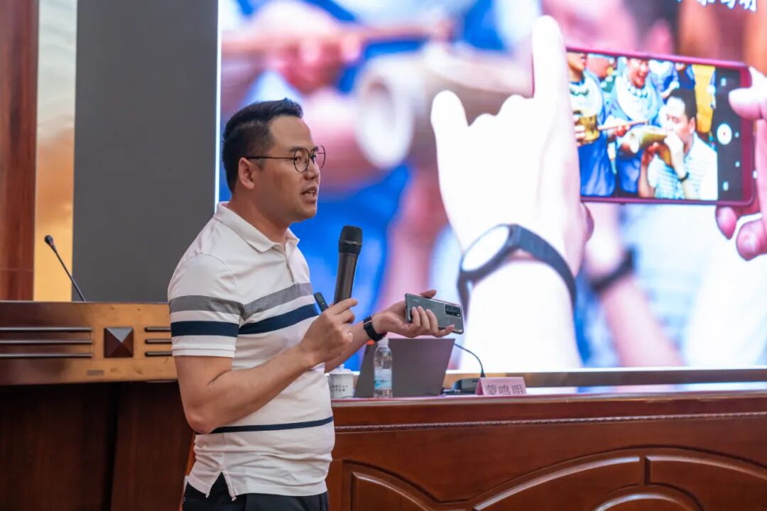 ▲蒙鸣明给基层单位讲授《手机短视频制作与传播》。