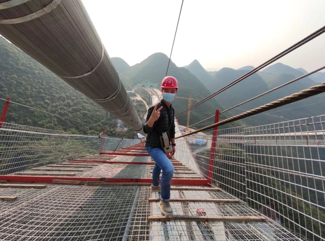 ▲2020年3月25日,作者在峰林特大桥猫道上拍摄完后留影。