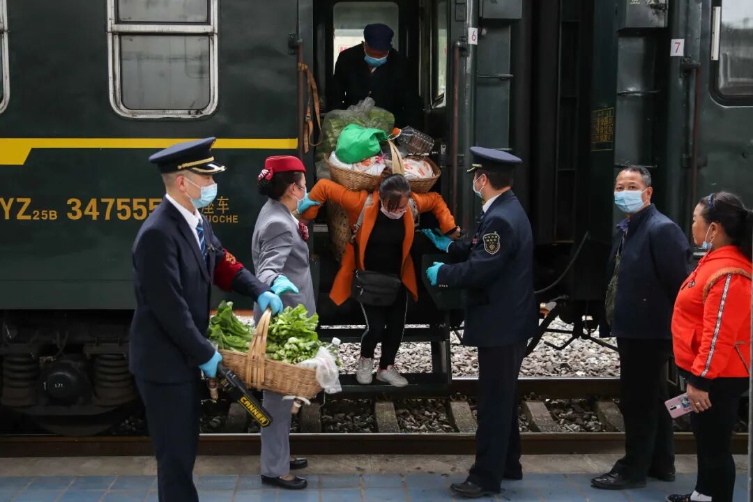 ▲图为4月16日,贵州桐梓火车站,列车员帮助到站菜农下车。