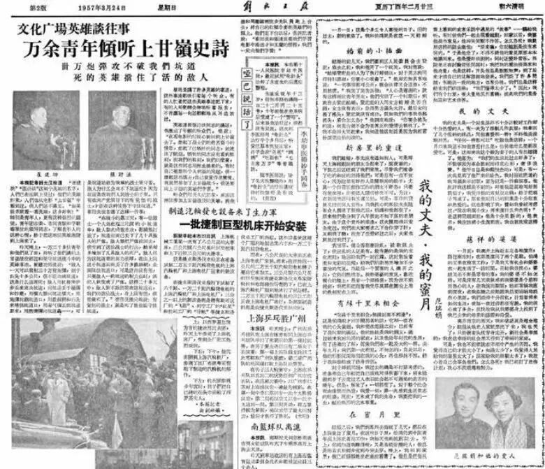 ▲图为1957年3月24日,《解放日报》第二版,《我的丈夫,我的蜜月》见报。(图源网络)