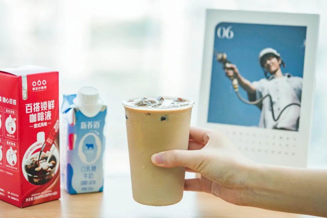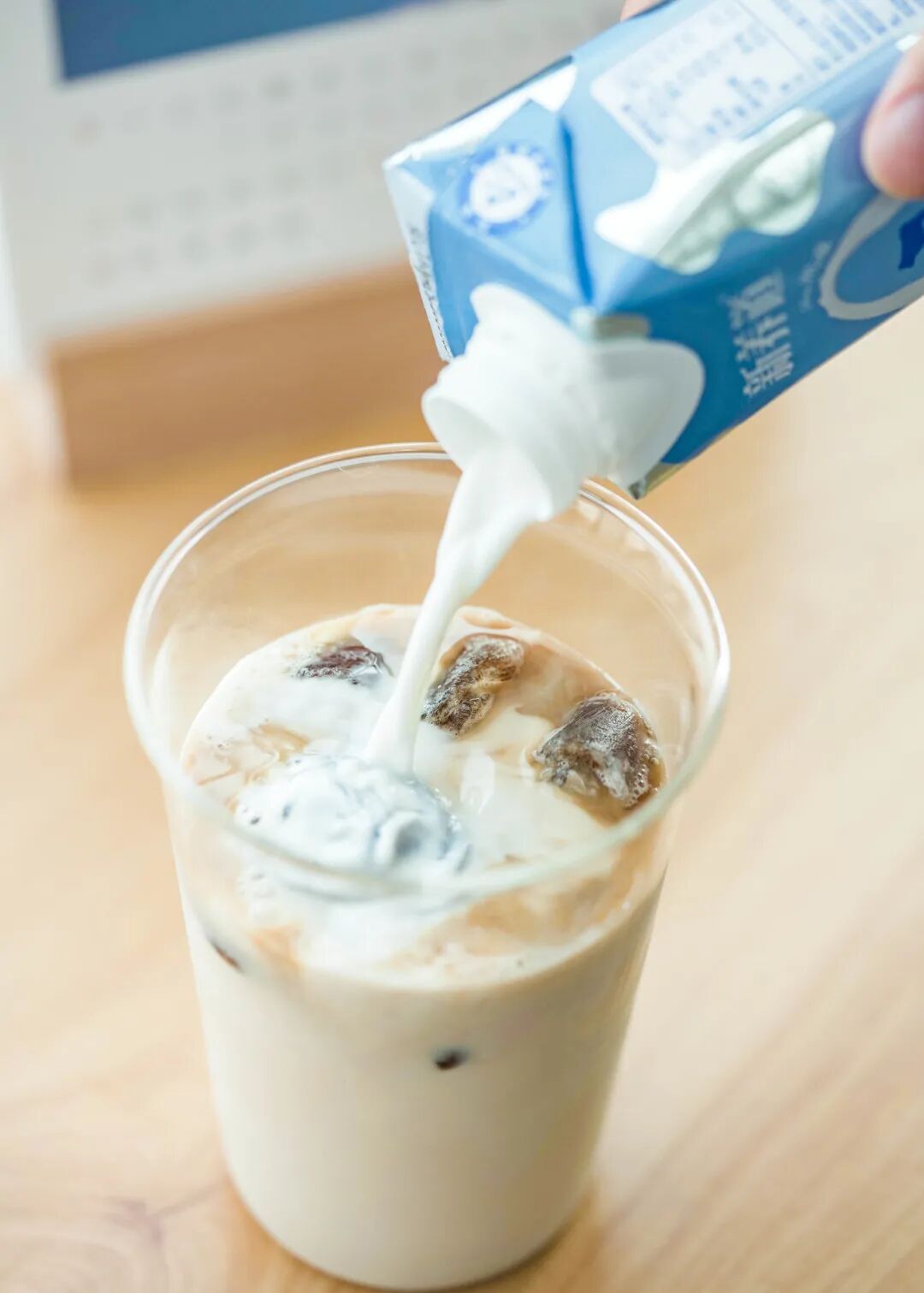 咖啡冰铺底,倒入0乳糖鲜奶,使之渐融。