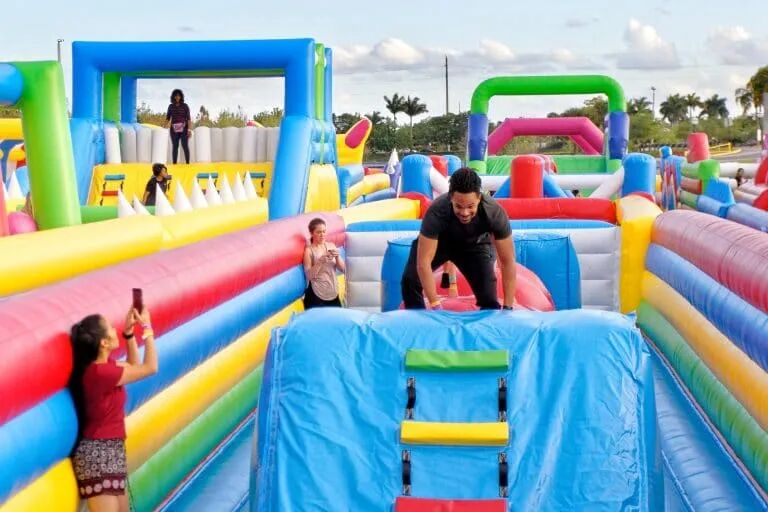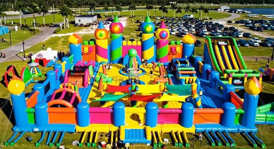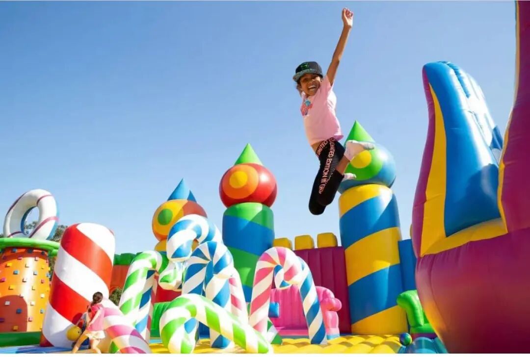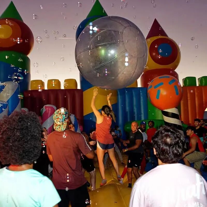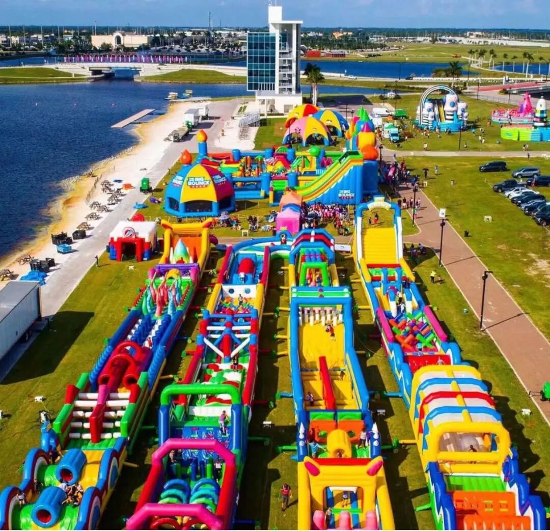 这座庞大的充气城堡占地超过 13,000 平方英尺,高耸于地面 32 英尺,里面设有色彩缤纷的炮塔、篮球架、球池、攀爬塔、巨型滑梯,大人小孩都可以玩!
