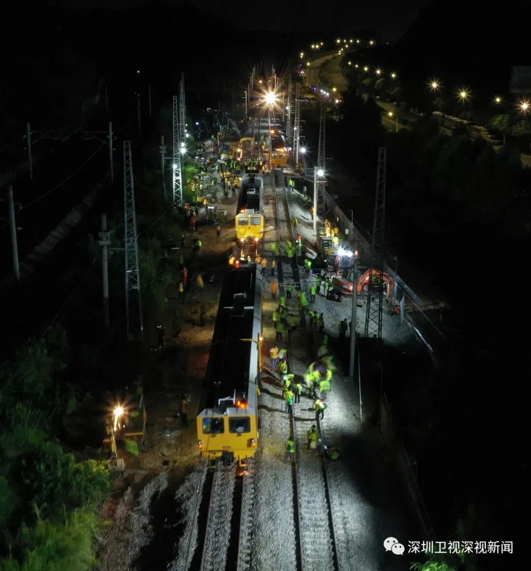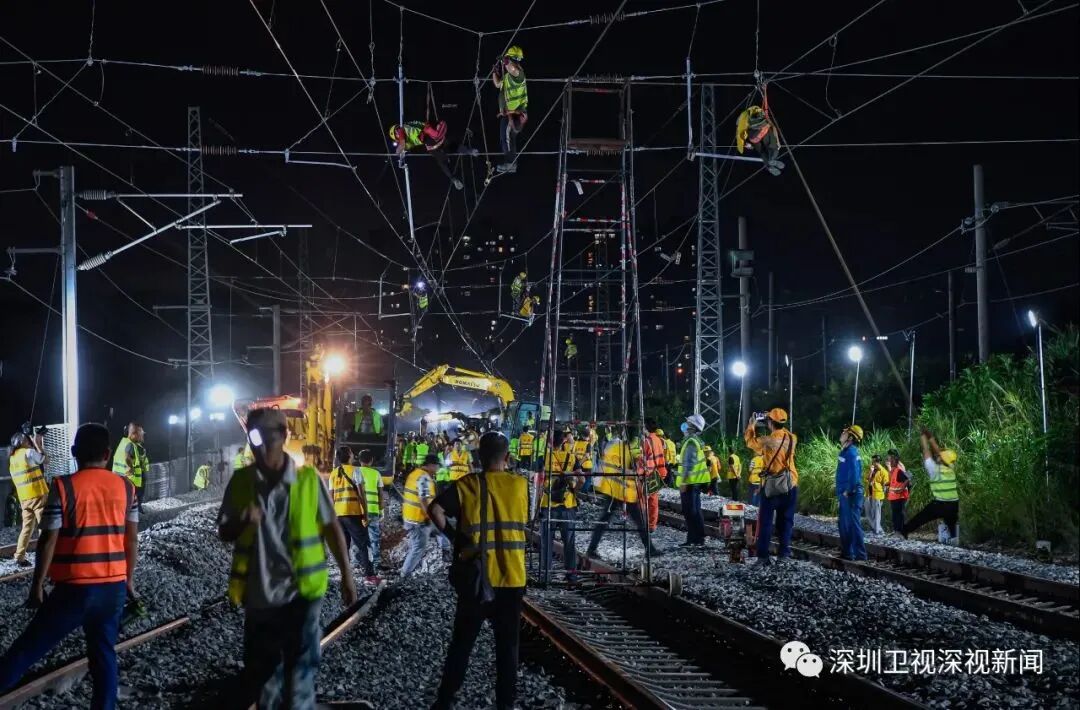 在广深Ⅰ、Ⅱ线樟木头城际场至平湖城际场间接触网停电后,千余名身着黄色防护服的作业人员迅速到达指定位置,在4个拨接口同时展开施工作业,有条不紊地进行既有线路拆除、扒砟降底、标高测量、道岔平移、封砟起道、大机养护、工电联整等施工。