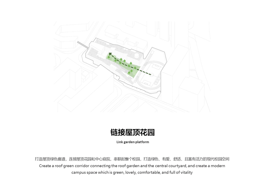 通过建筑退台创造连续的屋顶花园与操场空间有机连接,依据地势高差,在南北建筑体量之间形成“谷地花园”,创造出绿意盎然充满童趣的坡地景观。